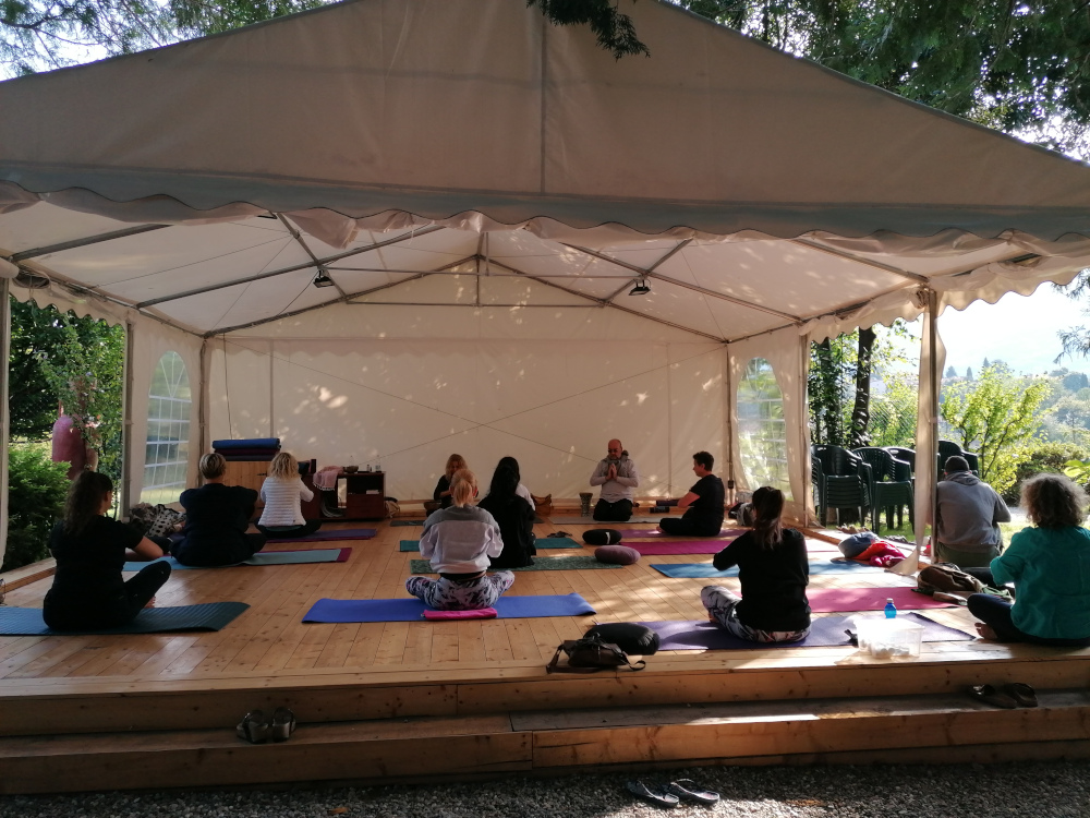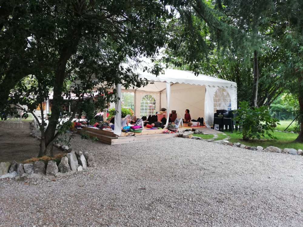 Il bel parquet chiaro sul quale è montato lo rende l’ambiente ideale per accogliere stuoie e cuscini per le pratiche a terra, per il lavoro di gruppo in cerchio, le sessioni di yoga, taijiquan, rilassamento e meditazione, così come per le danze e anche per le feste.